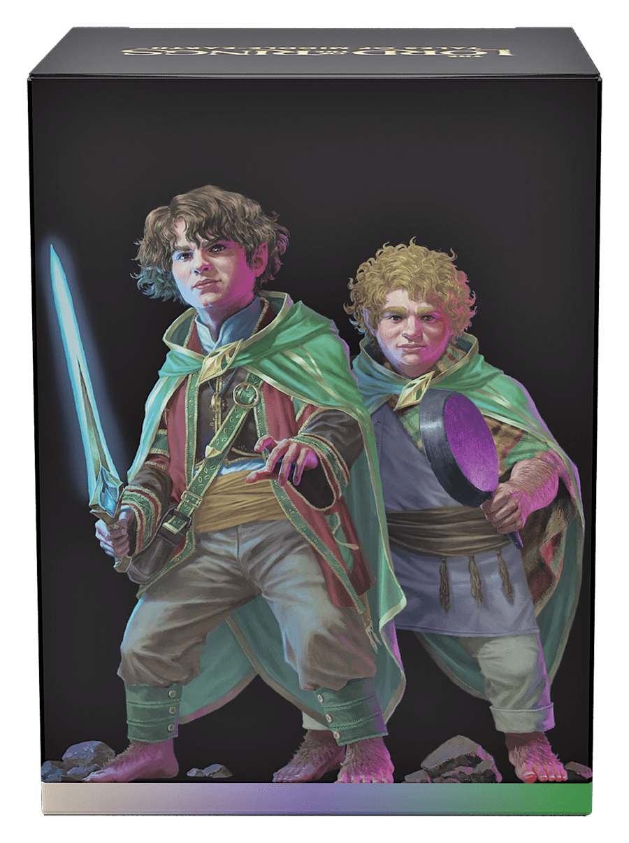CONTENIDO – 1 carta de El Señor de los Anillos: Cuentos de la Tierra Media (incluye 2 cartas Legendarias), un Sobre de Muestra de Coleccionista de 2 cartas, 1 Comandante con Expositor Grabado en Lámina, 10 fichas de doble cara, 1 carta de Ayudante, 1 contador de vidas y 1 caja de mazo.