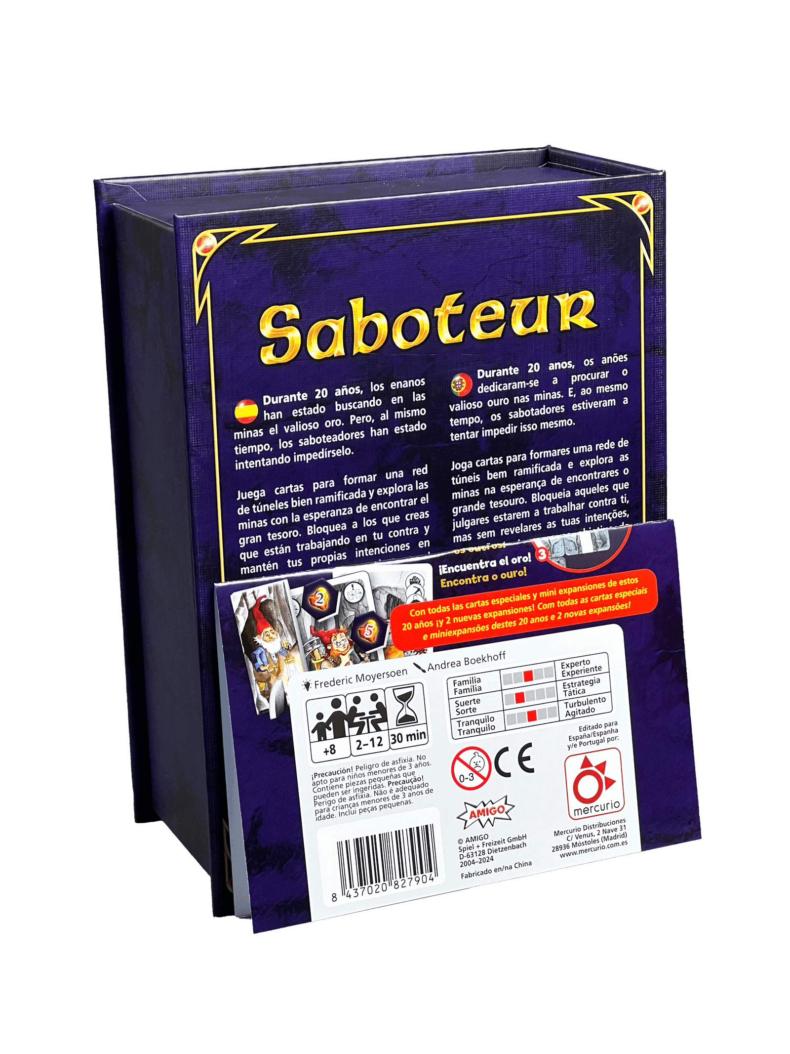 Durante 20 años, los enanos han estado buscando en las minas el valioso oro. Pero, al mismo tiempo, los saboteadores han estado intentando impedírselo. Juega cartas para formar una red de túneles bien ramificada y explora las minas con la esperanza de encontrar el gran tesoro. Bloquea a los que creas que están trabajando en tu contra y mantén tus propias intenciones en secreto, para que no te conviertas en el objetivo del sabotaje. Esta edición aniversario deluxe incluye todas las cartas especiales de los 20 años de Saboteur. Además, trae nuevas cartas de túnel y de destino, mini expansiones y variantes de juego que aportan giros sorprendentes y mucha variedad en el día a día de las minas. Mantente alerta y piensa bien en quién confíar, porque al final ¡solo cuenta el oro!