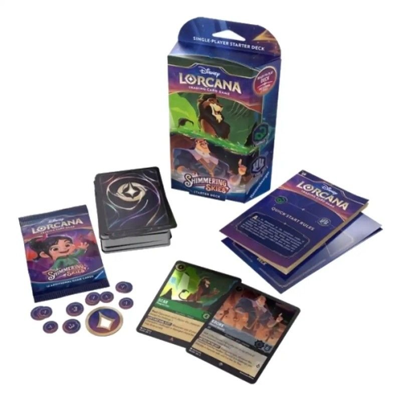 Los mazos de inicio, listos para jugar, contienen un mazo preconstruido con una lista específica de 60 cartas. Si eres nuevo en el mundo de los juegos de cartas coleccionables o si quieres experimentar el juego con un mazo diseñado y probado por el Equipo Disney Lorcana, esta es la mejor forma de empezar.