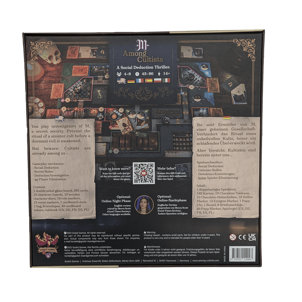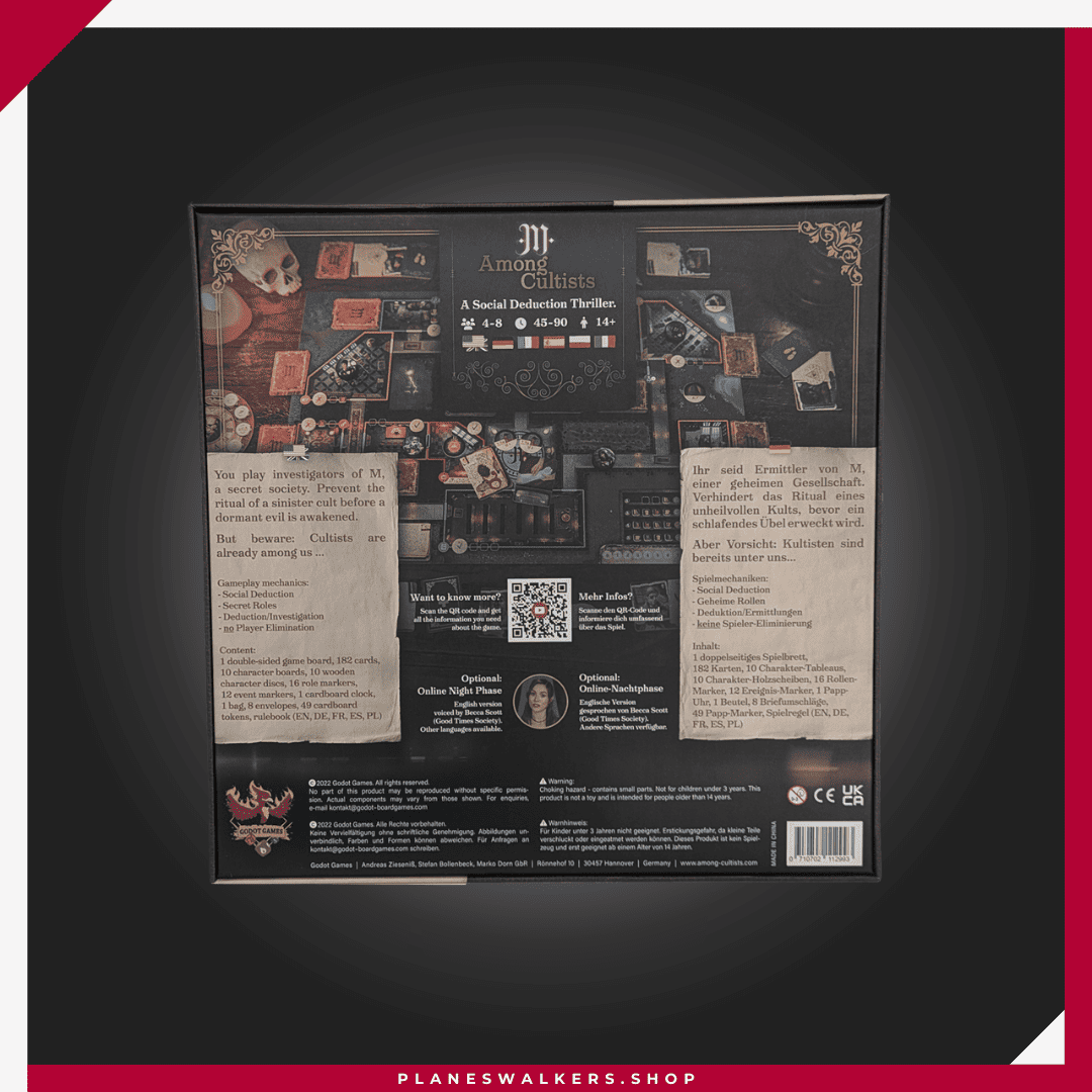 Among Cultists es un juego de deducción para 4 a 8 jugadores con agendas ocultas a partir de 14 años y una duración de unos 45-90 minutos.
