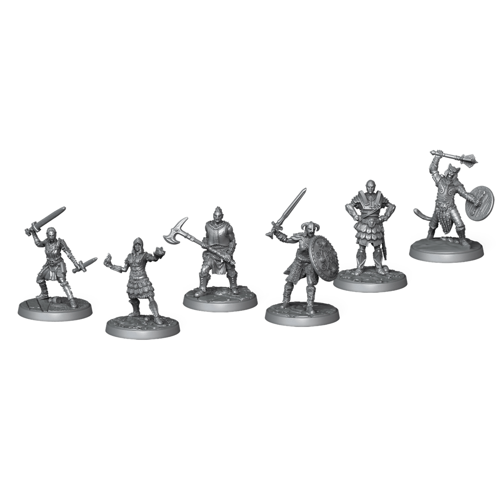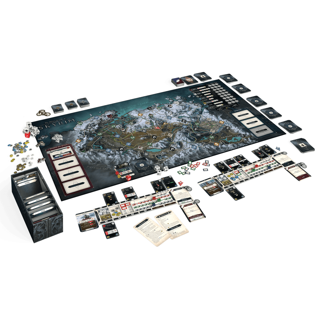 6 miniaturas de jugador, 8 dados de habilidad, 1 dado de Enemigo, 4 cubos de Salud, 4 cubos de Aguante, 4 cubos de Magia, 18 cubos de Armadura, 12 fichas de Límite de medidor, 4 fichas de Golpe final, 72 fichas de Habilidad, 42 fichas de Experiencia, 42 fichas de Oro, 72 fichas de Componentes, 100 fichas de Amenaza, 24 indicadores de Misión, 12 indicadores de Misión de jugador, 1 ficha de Jugador inicial, 4 fichas de Caballo, 1 ficha de Milicia de Ulfric, 34 fichas de Monstruo errante, 4 paneles de personaje, 1 tablero de juego, 1 reglamento, 1 libro de tutorial/escenarios, 297 cartas de Misión, 54 cartas de Mazmorra, 67 cartas de Encuentro, 25 cartas de Seguidor, 6 cartas de Personaje, 196 cartas de Objeto, 46 cartas de Encantamiento/Mejora, 40 cartas de Estado, 68 cartas de Evento, 20 cartas de Naturaleza, 20 cartas de Población, 6 cartas de Reto de Mazmorra, 4 cartas de referencia.
