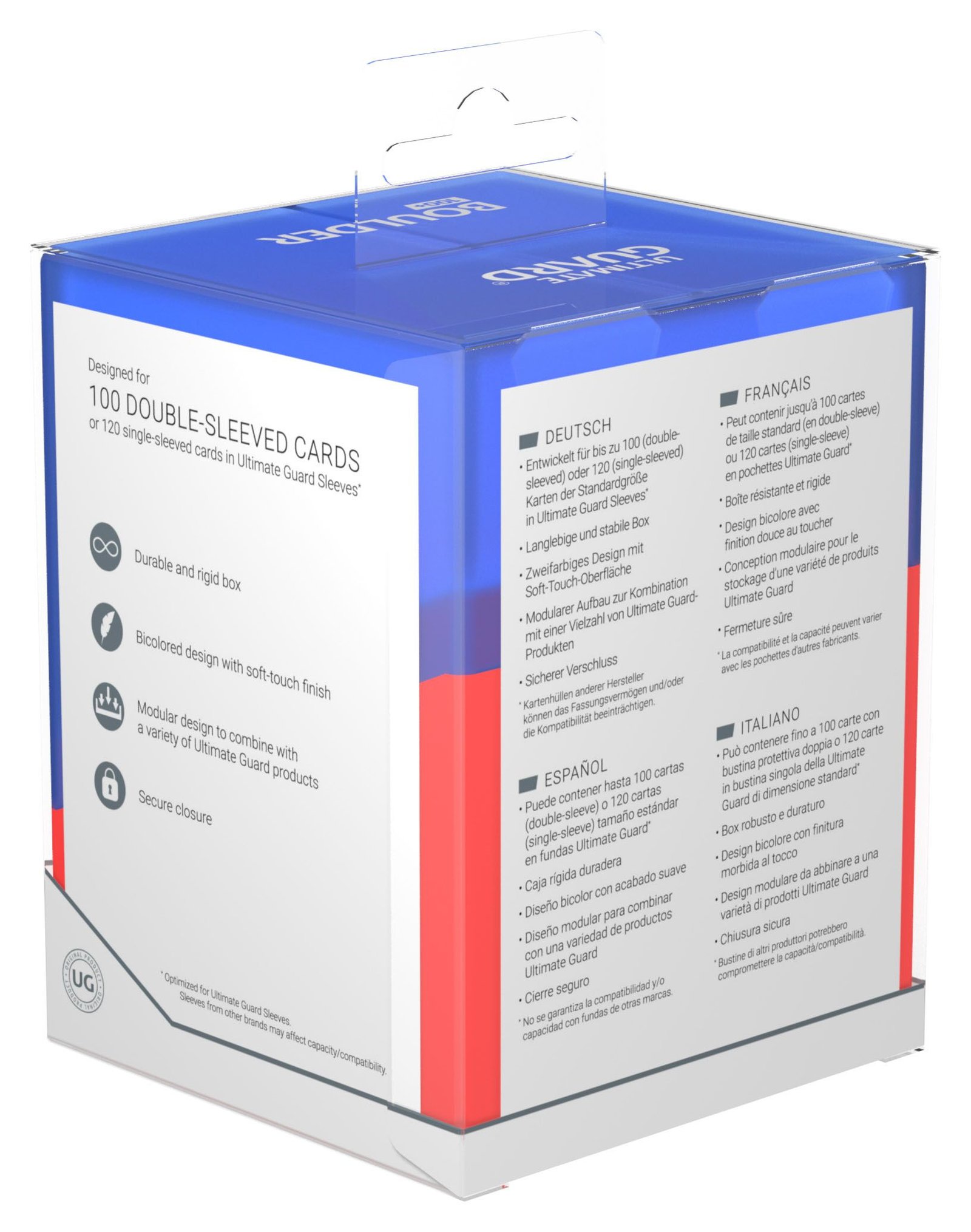 Puede contener hasta 100 cartas (doble funda) o 120 cartas (funda única) tamaño estándar en fundas Ultimate Guard