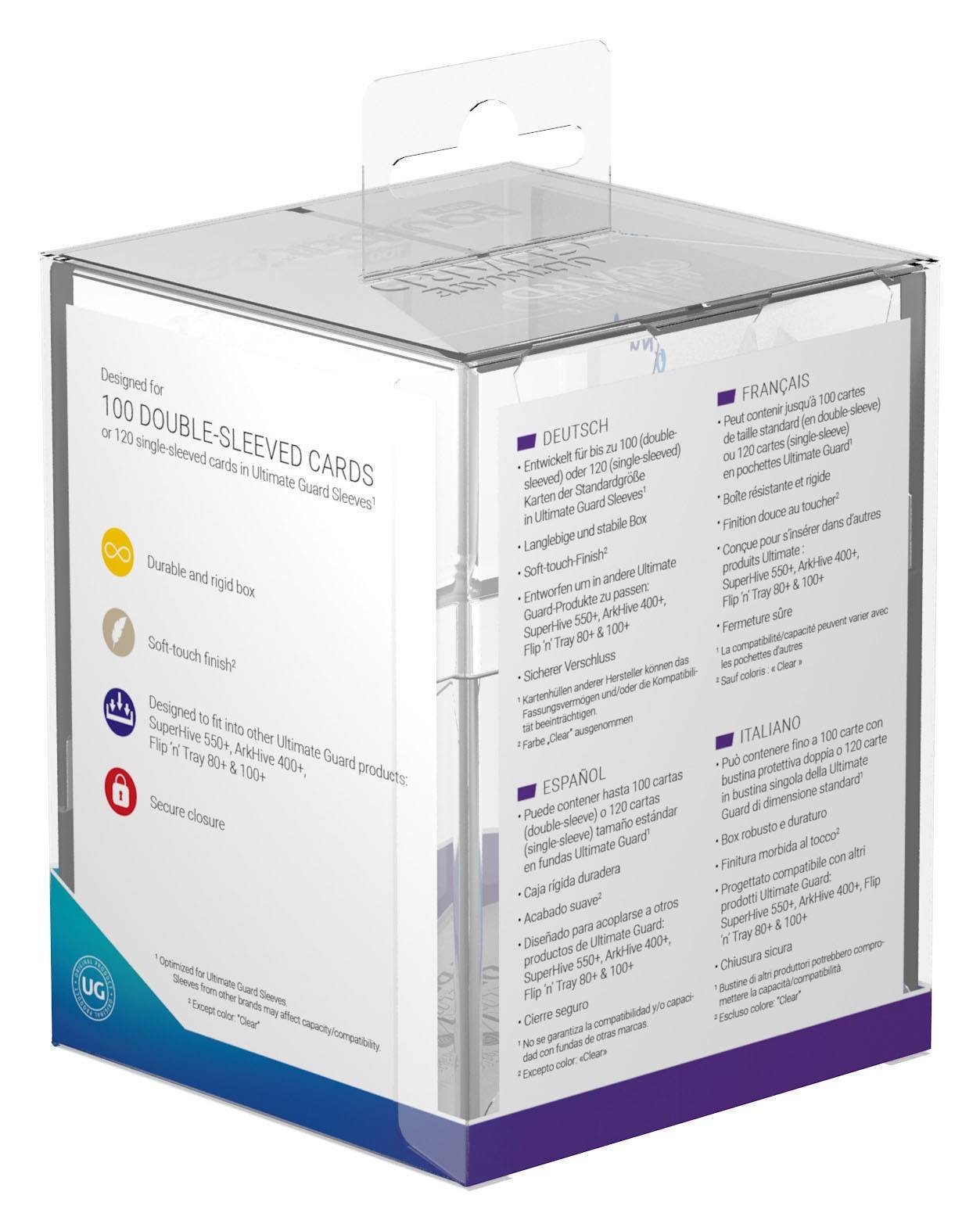 - Designed for 100 double-sleeved or 120 single-sleeved standard sized cards in Ultimate Guard Sleeves