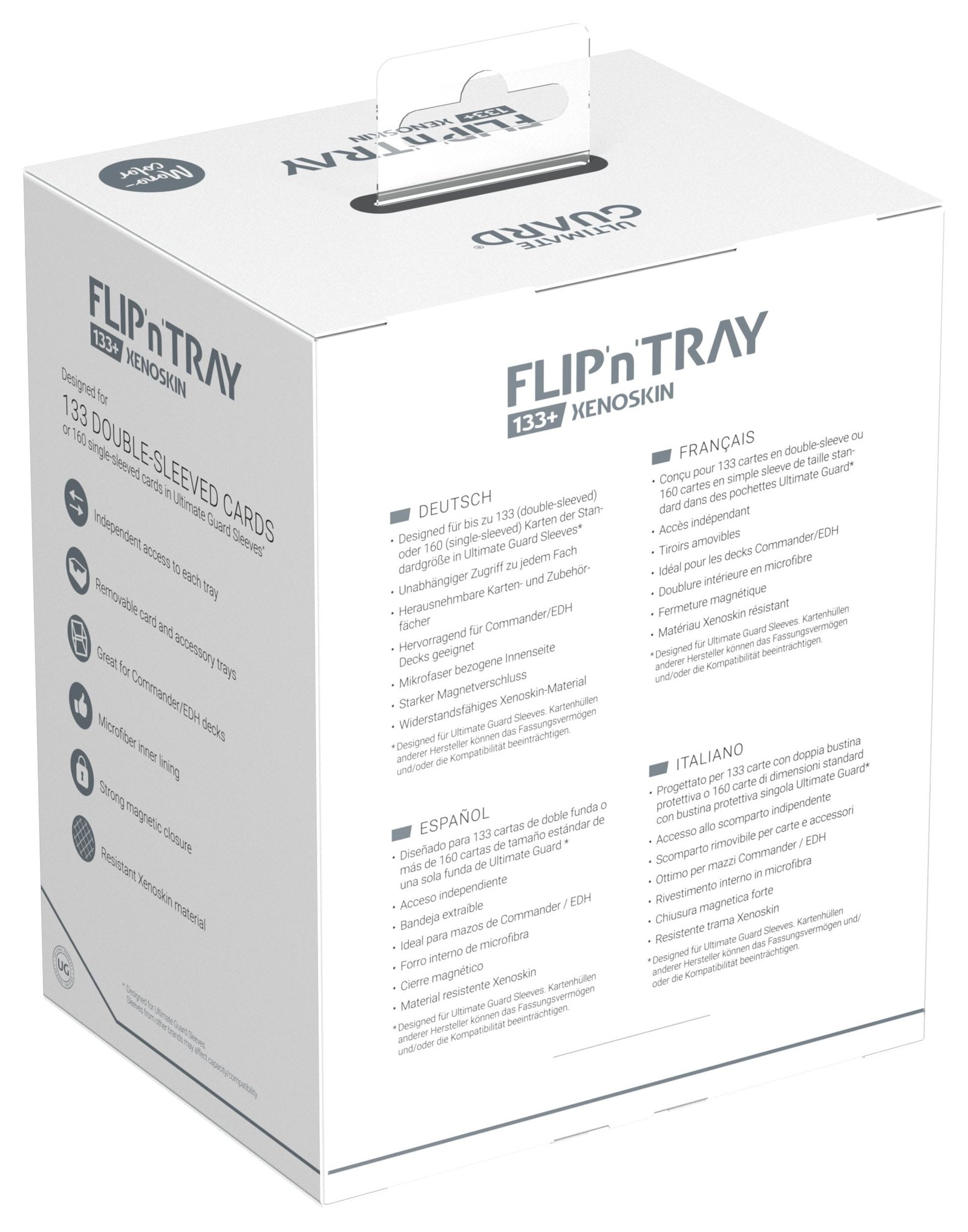 La última versión de la legendaria Flip’n’Tray de Ultimate Guard ofrece aún más espacio: La Flip’n’Tray 133+ Xenoskin tiene capacidad para 133 cartas