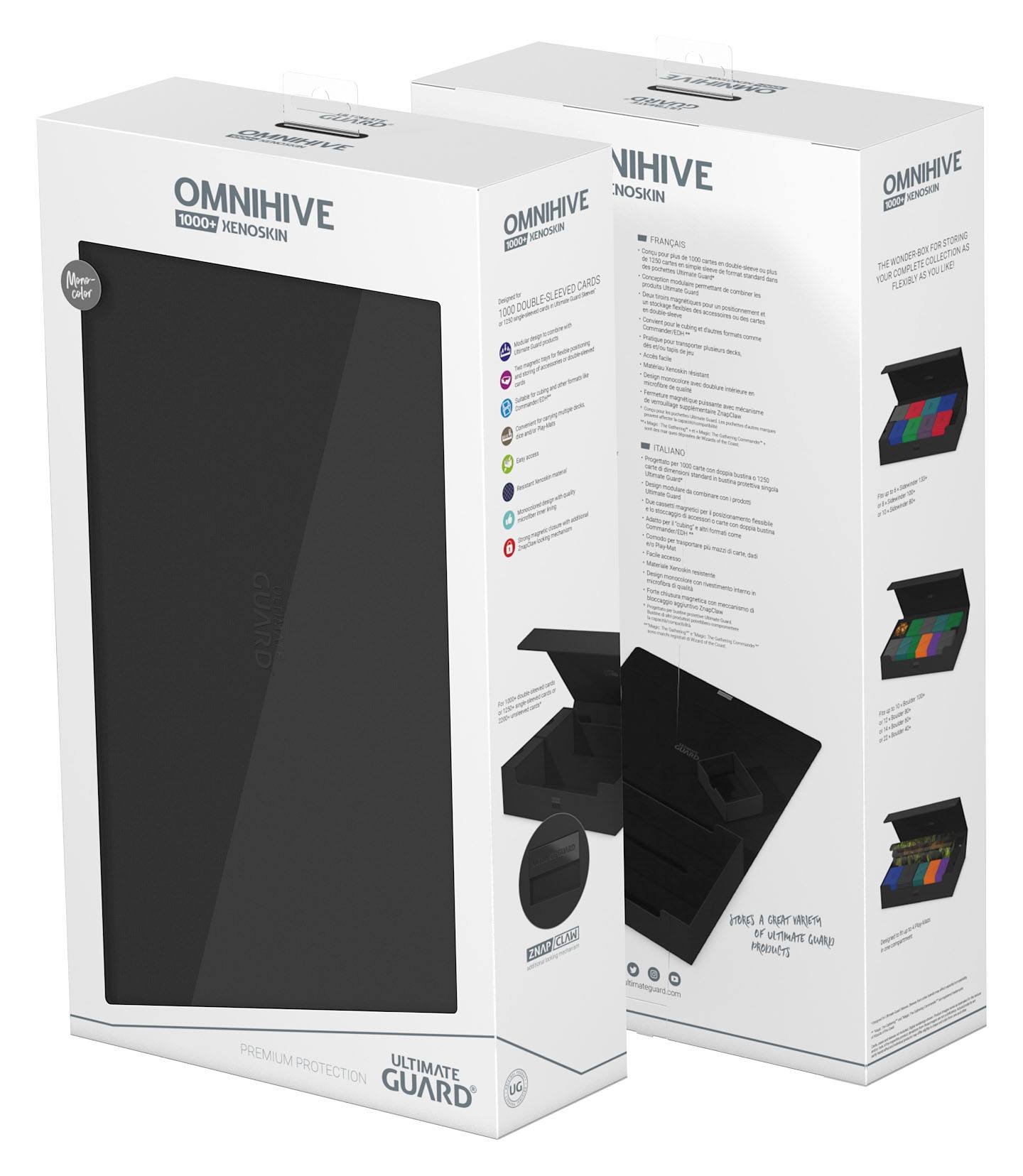 ¡Presentamos el nuevo Omnihive 1000+! La caja más espaciosa y flexible para almacenar grandes colecciones. Esta caja puede contener más de 1000 cartas de doble funda o llevar varios mazos y / o tapetes además de otros productos de Ultimate Guard como el Sidewinder 133+. Dos bandejas extraíbles, magnéticas, ajustables y apilables hacen que esta caja sea única: se adapta a todo tipo de juegos y formatos, y permite múltiples formas diferentes de almacenar y organizar tu colección.