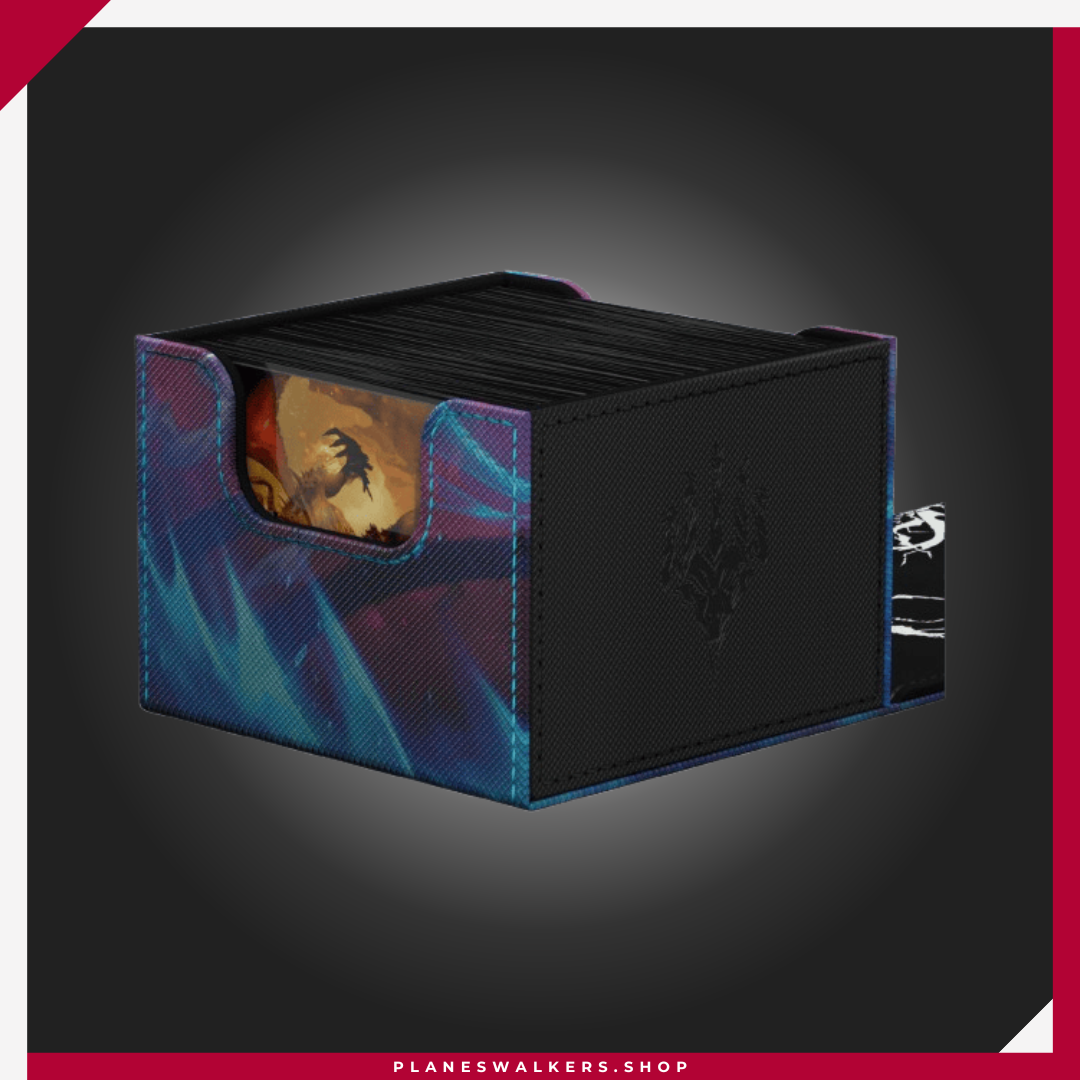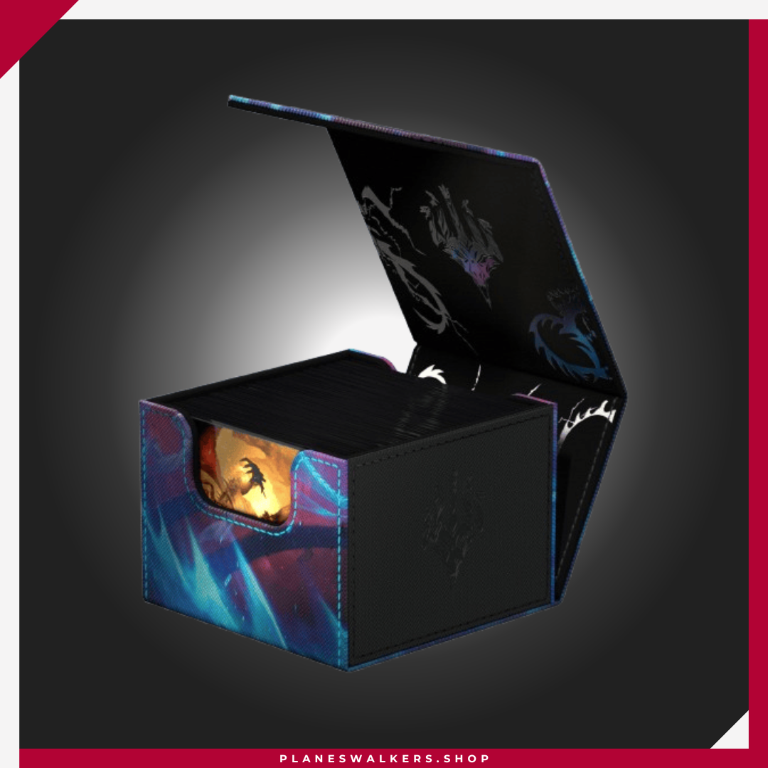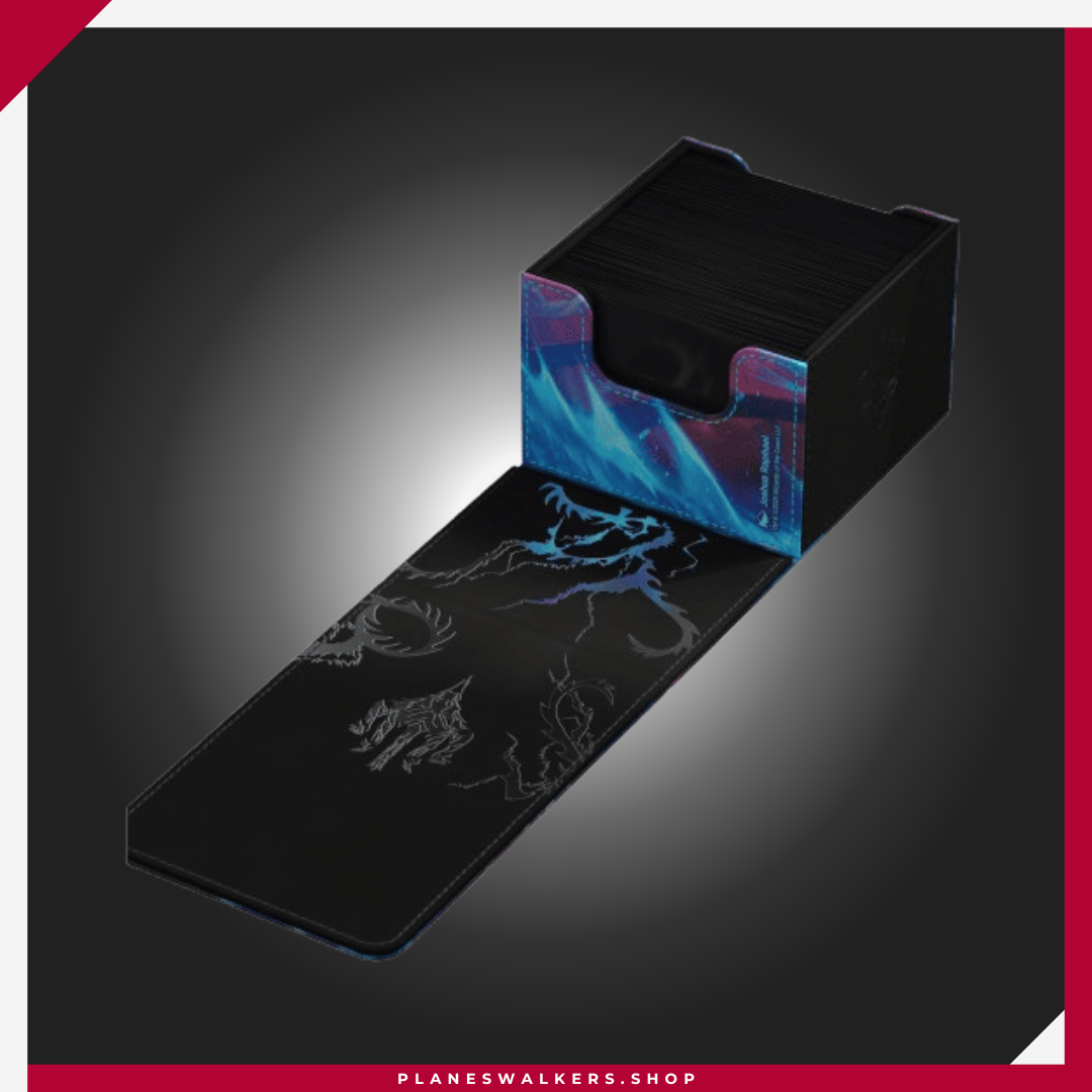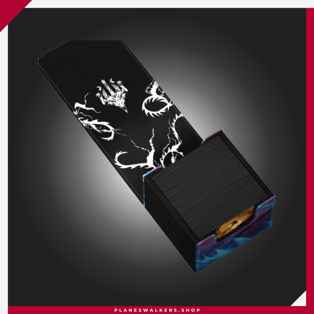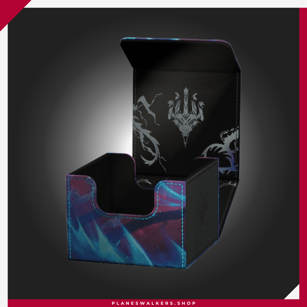 El Sidewinder 133+ es la caja de mazo perfecta para mazos de Commander/EDH, ofreciendo espacio adicional para cartas y fichas adicionales. Diseñada para contener 133 cartas de doble funda (160 de sola funda), la superficie duradera de Xenoskin del Sidewinder 133+ está decorada con ilustraciones con licencia oficial del set Tarkir: Tormenta Dracónica de Magic: The Gathering. Un cierre magnético fuerte y el interior forrado de microfibra aseguran un almacenamiento seguro de las cartas.